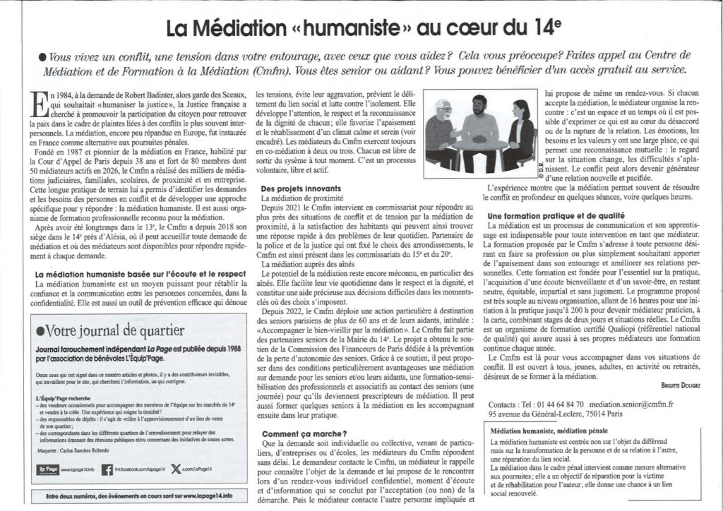 J’ai le plaisir de partager l’article qui vient d’être publié dans la Page 14, journal indépendant du 14e qui tire à 1000 ex. L’interview a eu lieu au Cmfm avec Céline Jousselme qui avait établi le contact avec l’équipe de rédaction lors du forum sénior du 14e en décembre.